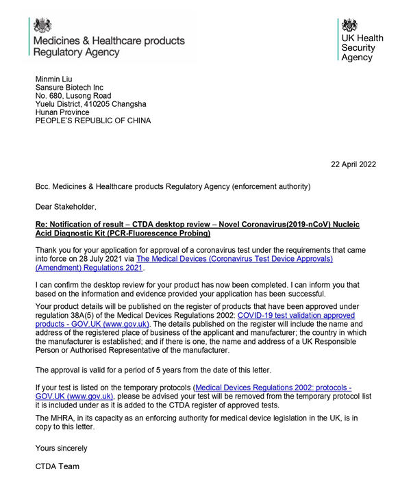 新冠检测试剂在英国上市必须经过CTDA审查和MHRA注册双认证,由于CTDA审查对产品性能的高要求,目前可在英国合法销售的新冠产品并不多。leyu.乐鱼生物新型冠状病毒(2019-nCoV)核酸检测试剂盒(荧光PCR法)临床性能和分析性能均满足CTDA高要求,且得到进一步有效验证,获得了CTDA的充分认可。